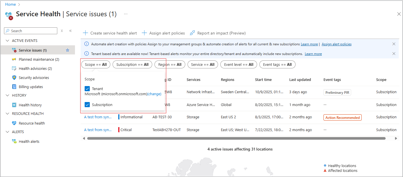 On the Service issues pane, you can filter by Scope. The Scope column indicates when an event is affecting the Tenant level or Subscription level.