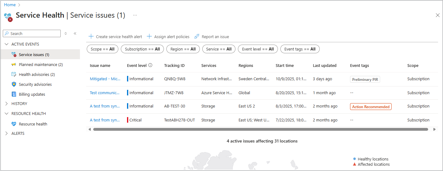 - Service issues: Problems in the Azure services that affect you right now.