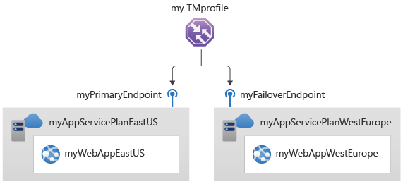 Setting Value Type Select Azure endpoint. Name Enter myFailoverEndpoint. Target resource type Select App Service. Target resource Select Choose an app service > West Europe. Priority Select 2. All traffic goes to this failover endpoint if the primary endpoint is unhealthy. Select Add.