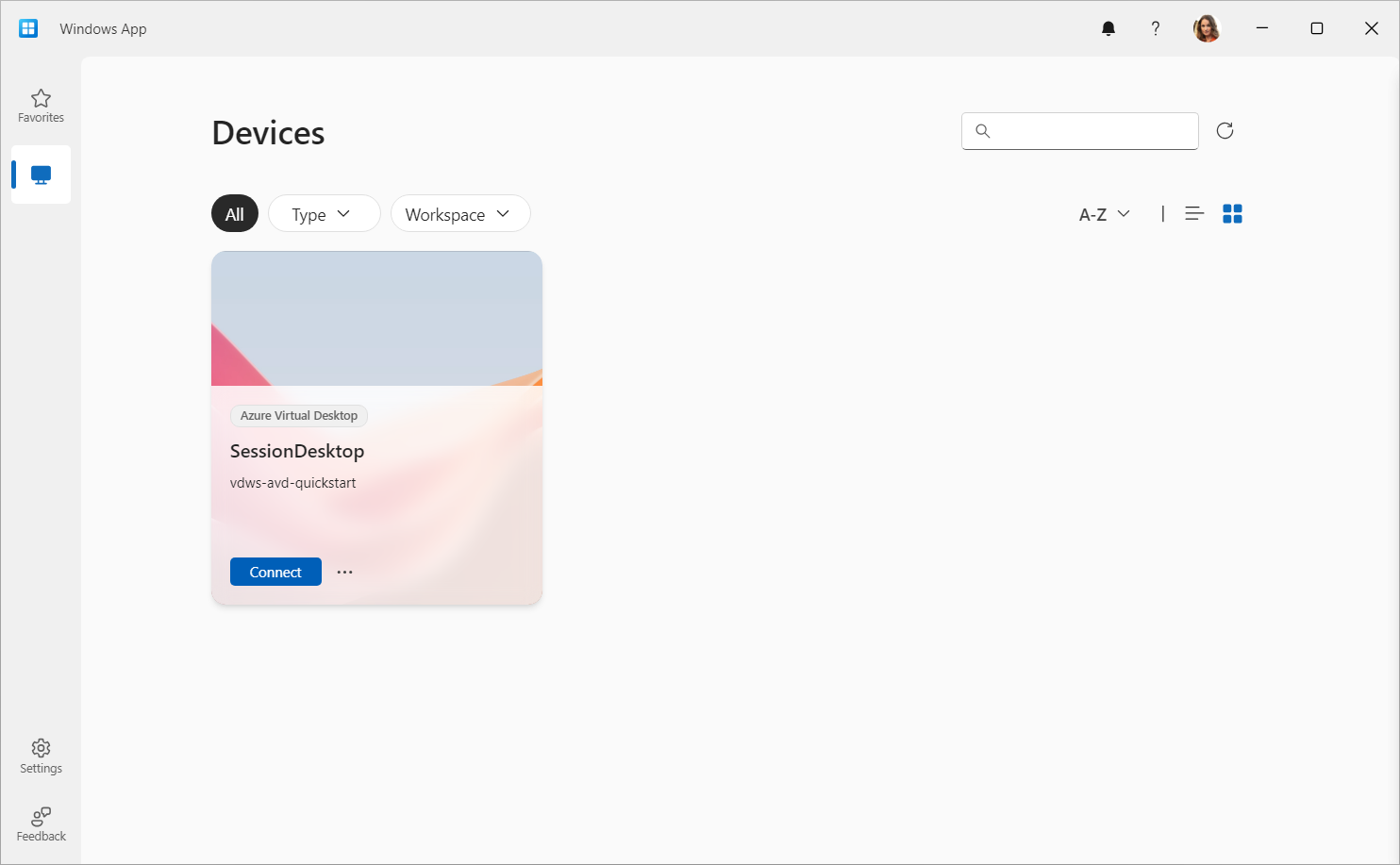 The desktop you created is shown as a tile called SessionDesktop. Select Connect.