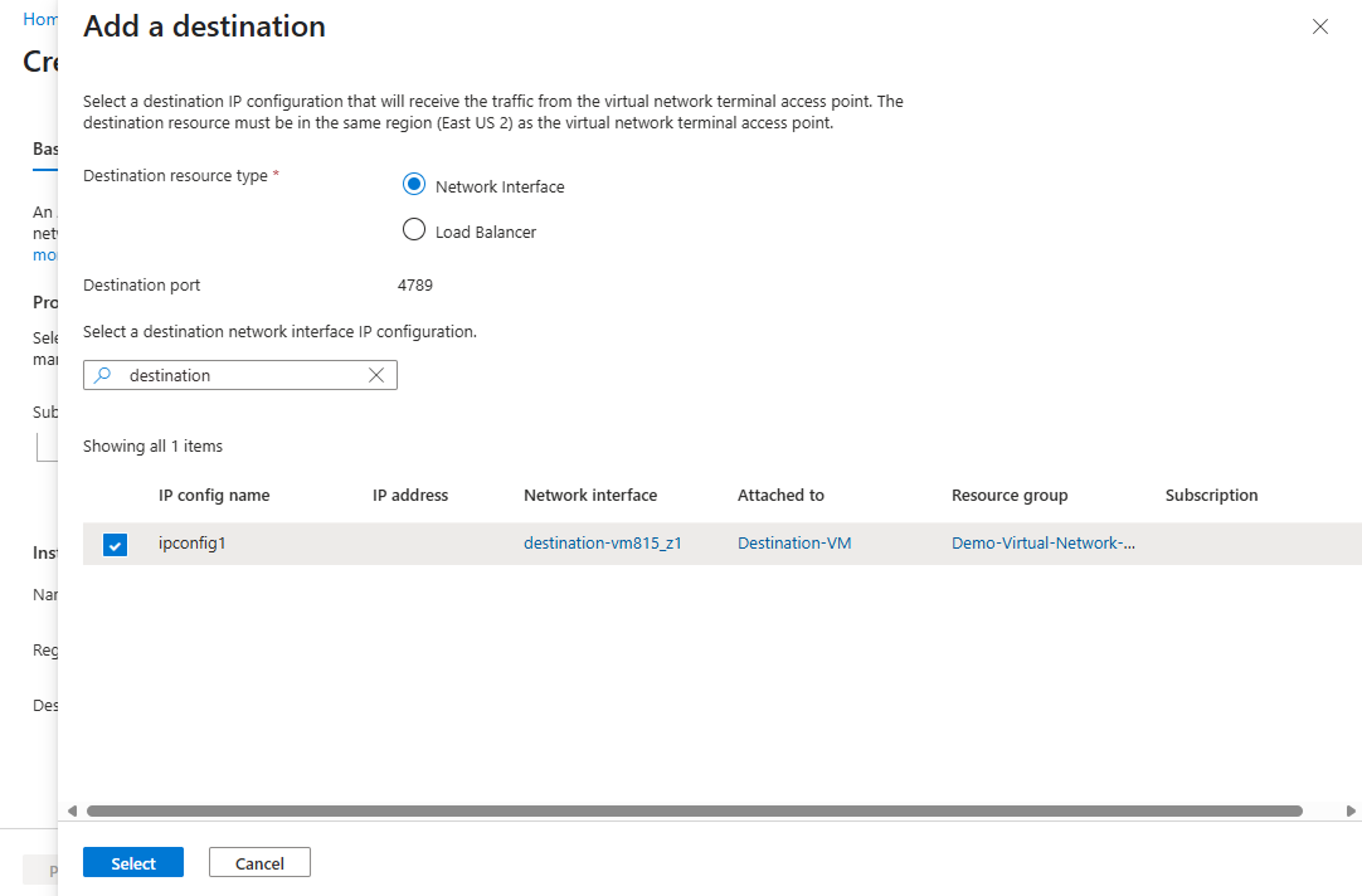 - After you specify your destination resource, click Select to open the Add source network interfaces page.