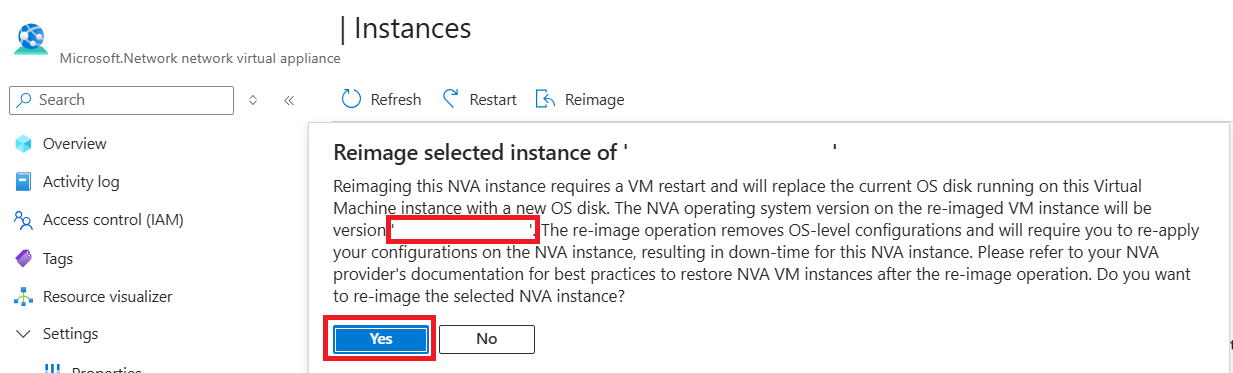 Select Reimage and read the disclosure on the screen and note the OS software version that the post-reimage NVA instance will be running. Confirm the reimage by selecting Yes.