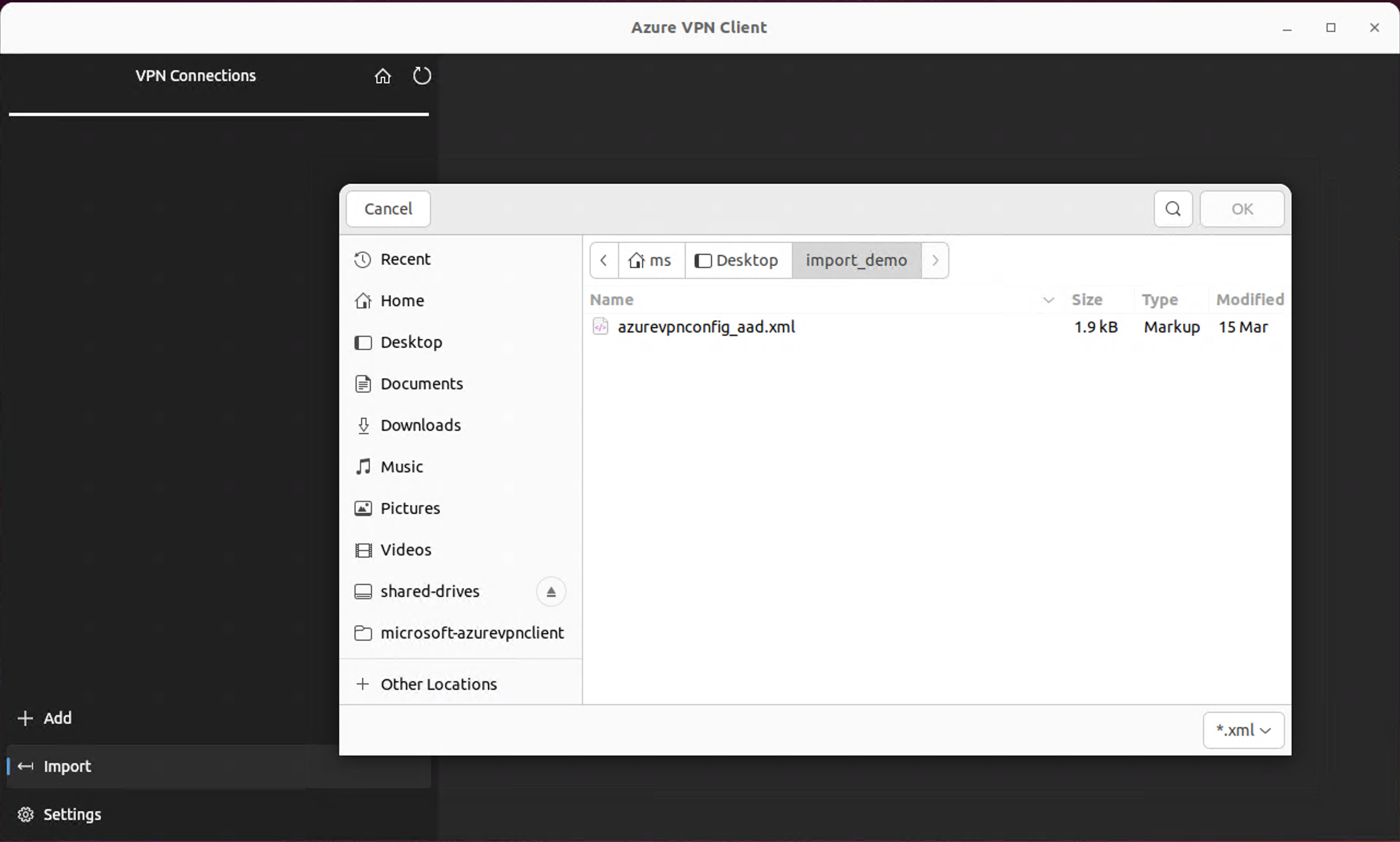 On the Azure VPN Client page, in the lower left pane, select Import.