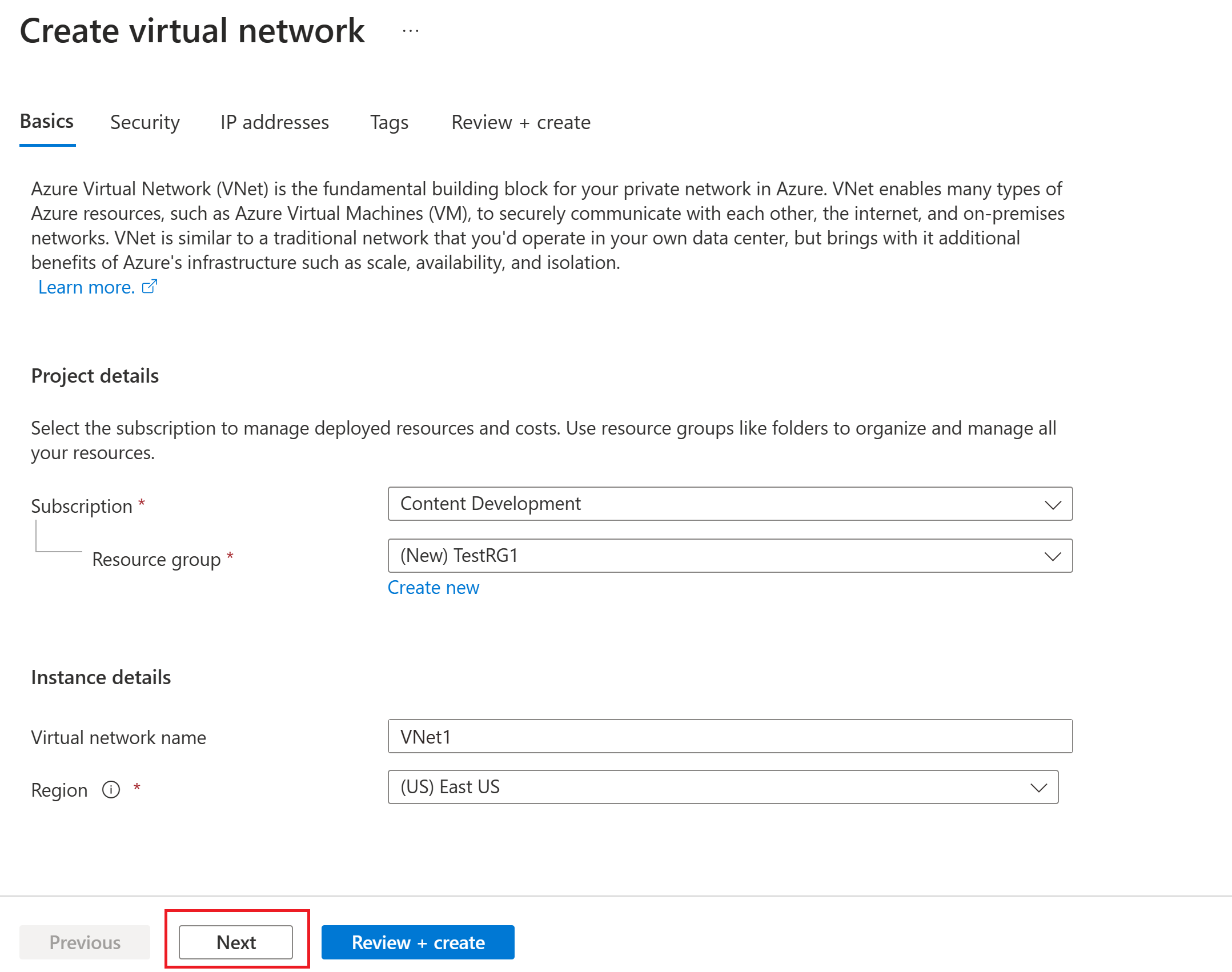 On the Virtual network page, select Create to open the Create virtual network page.