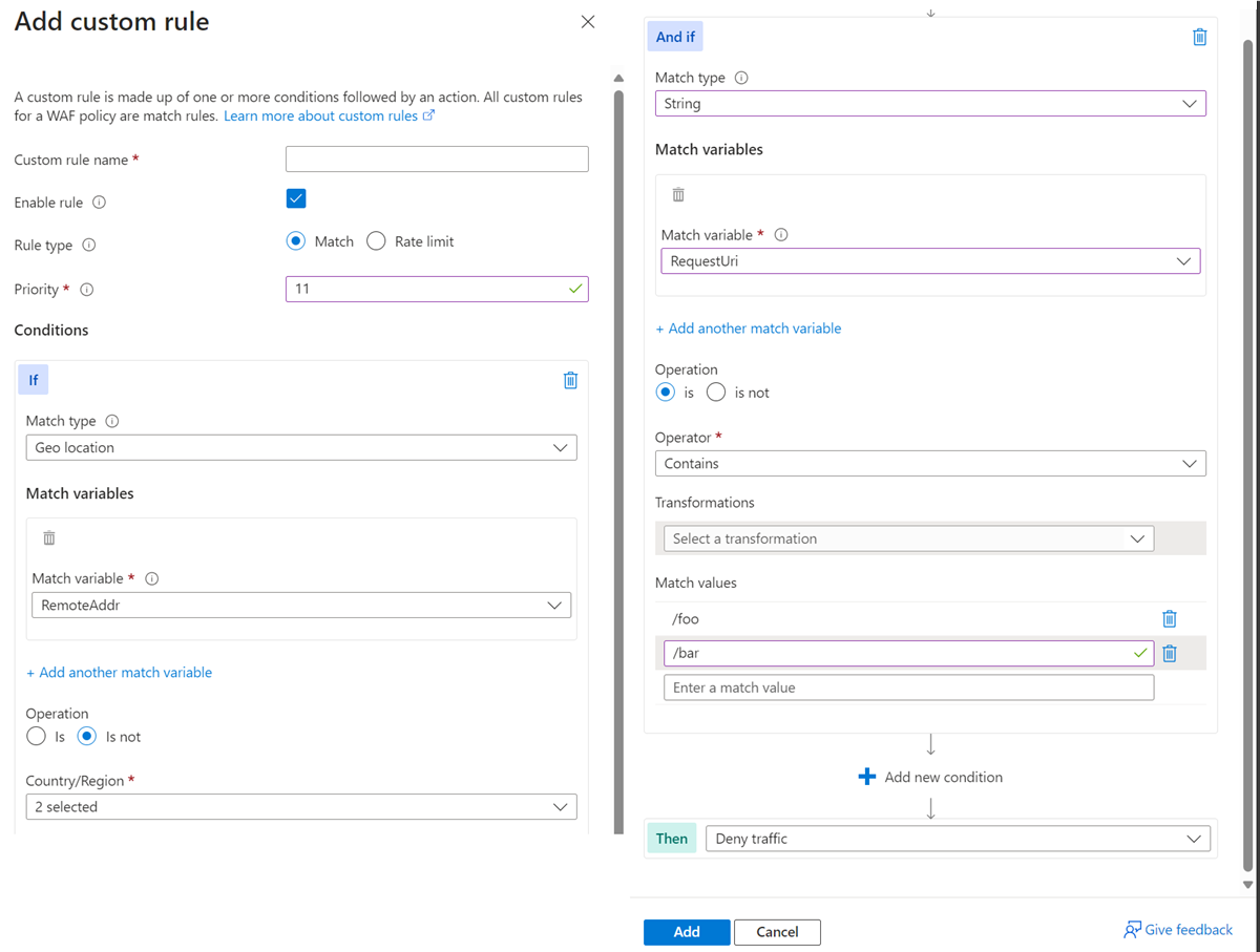 Scenario 2 - Block traffic from all countries or regions except "x" and "y" that target the URI "foo" or "bar"
