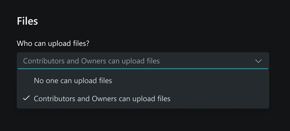 Owners can choose who are allowed to upload files in owner settings. The options are: