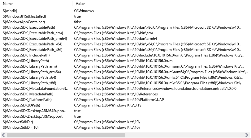 This action changes the values of project macros that include paths to header files and library files. To see what changed, open the Visual C++ Directories section of the Project Properties dialog. Select one of the properties, such as Include Directories. Then, open the property value's dropdown list, and choose <Edit>. The Include Directories dialog appears.