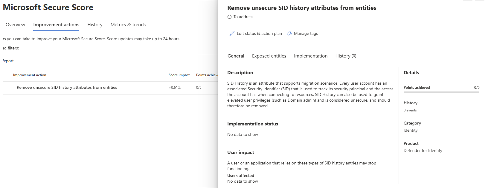 Review the recommended action at https://security.microsoft.com/securescore?viewid=actions to discover which of your accounts have an unsecure SID History attribute.