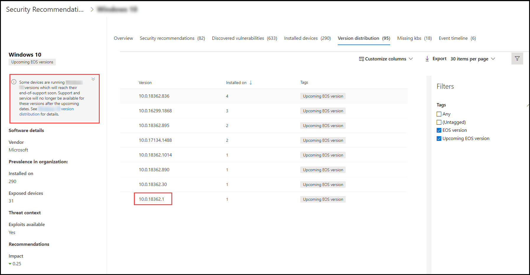 You see a list of recommendations related to software with ended support, software versions that are end of support, or versions with upcoming end of support. These tags are also visible in the software inventory page. Tags for versions with upcoming end of support displays up to six months in advance.