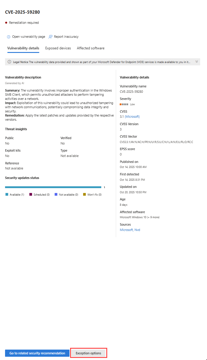 To learn more about exceptions, see Exceptions in Microsoft Defender Vulnerability Management.
