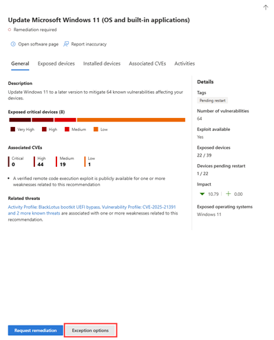 - The organization's exposure score and secure score may be updated to reflect the exception. For more information, see View impact after exceptions are applied and Exposed devices and impact after exceptions.