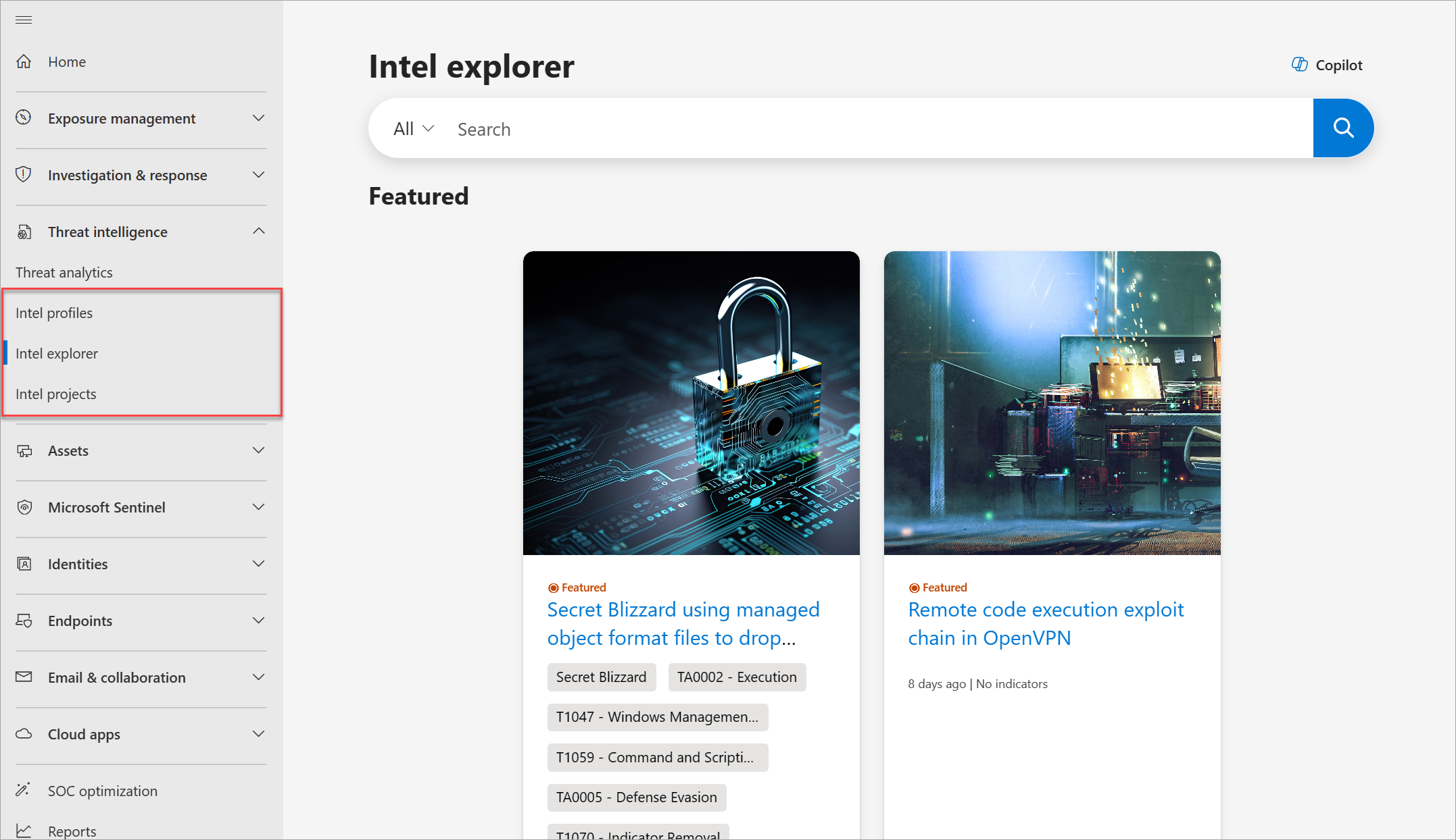 The Featured threat intelligence articles widget in the Defender portal home page displays the recent Defender TI publications that are tagged as Featured articles: