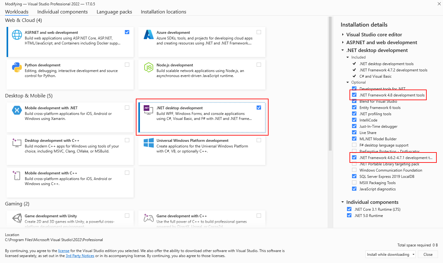 From the developer pack download page, choose Download. Next, choose Run or Save, and follow the instructions when prompted. You can also install the developer pack or targeting pack for a specific version of .NET Framework by selecting it from the optional components in the .NET desktop development workload in the Visual Studio Installer, as the following figure shows.