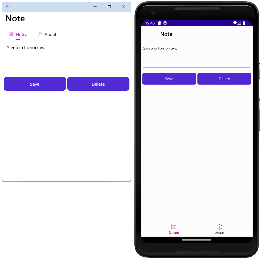 <?xml version="1.0" encoding="utf-8" ?> <ContentPage xmlns="http://schemas.microsoft.com/dotnet/2021/maui" xmlns:x="http://schemas.microsoft.com/winfx/2009/xaml" xmlns:models="clr-namespace:Notes.Models" x:Class="Notes.Views.NotePage" Title="Note" x:DataType="models:Note"> <VerticalStackLayout Spacing="10" Margin="5"> <Editor x:Name="TextEditor" Placeholder="Enter your note" Text="{Binding Text}" HeightRequest="100" /> <Grid ColumnDefinitions="*,*" ColumnSpacing="4"> <Button Text="Save" Clicked="SaveButton_Clicked" /> <Button Grid.Column="1" Text="Delete" Clicked="DeleteButton_Clicked" /> </Grid> </VerticalStackLayout> </ContentPage>