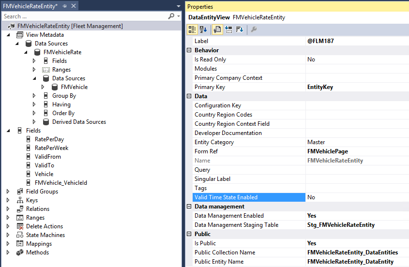 In Solution Explorer, select the FMVehicleRateEntity node, and validate the properties of the FMVehicleRateEntity entity by comparing them to the values in the Properties pane.
