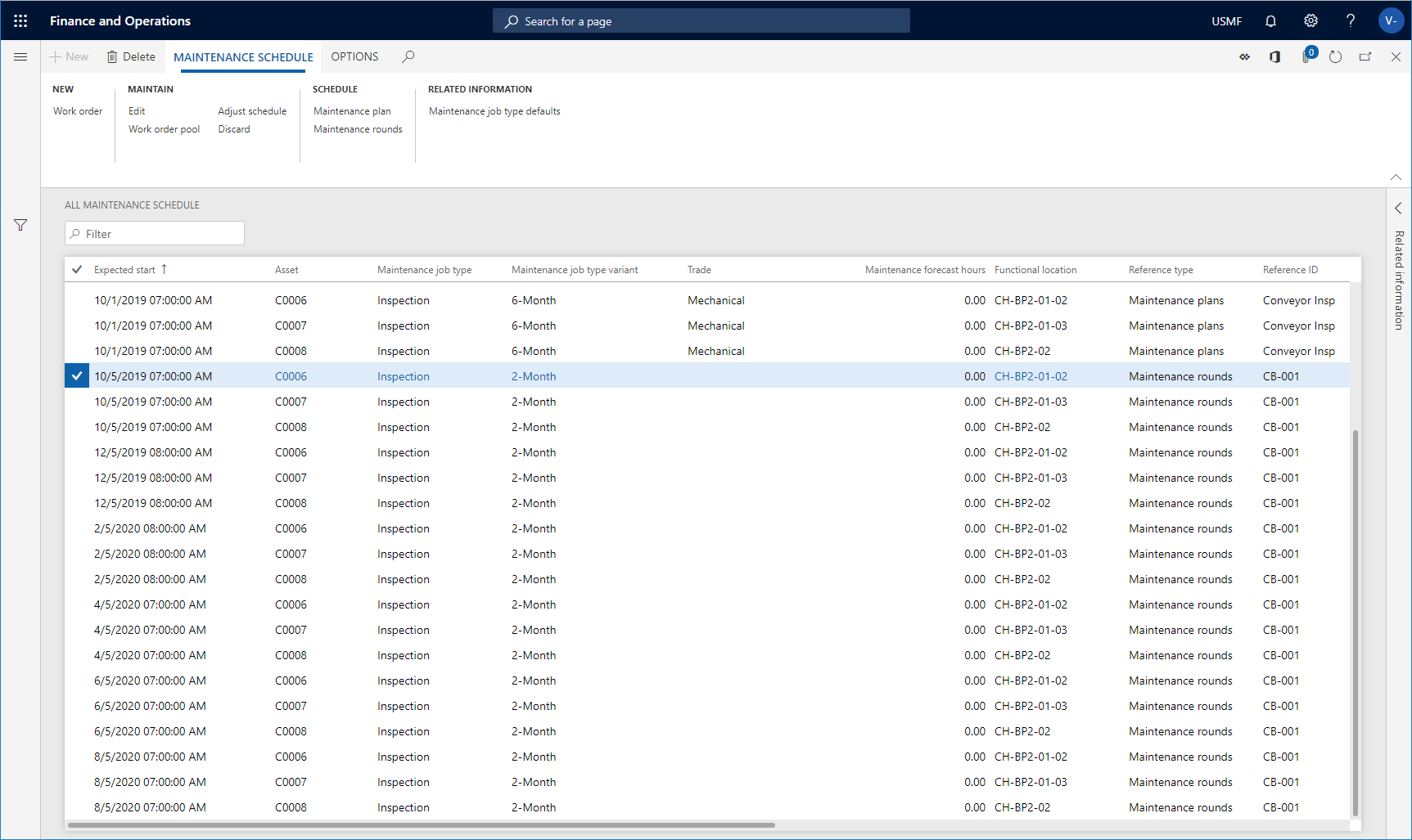 You're now able to see the maintenance rounds jobs in Asset management > Maintenance schedule > All maintenance schedule or Open maintenance schedule lines. If the scheduled rounds are connected to a work order pool, you also see maintenance schedule lines in Open maintenance schedule pools. Maintenance schedule lines created from a round have the reference type Maintenance rounds.