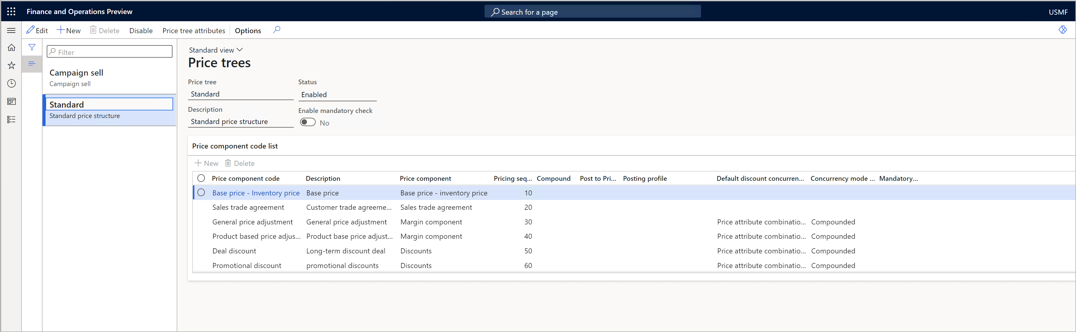 On the Price component code list FastTab, add each price component code that should be part of the price structure for the current price tree. Use the buttons on the toolbar to add and remove lines as required. For information about how to set these fields, and examples that show how the settings work, see Arrange price component codes into a price structure.