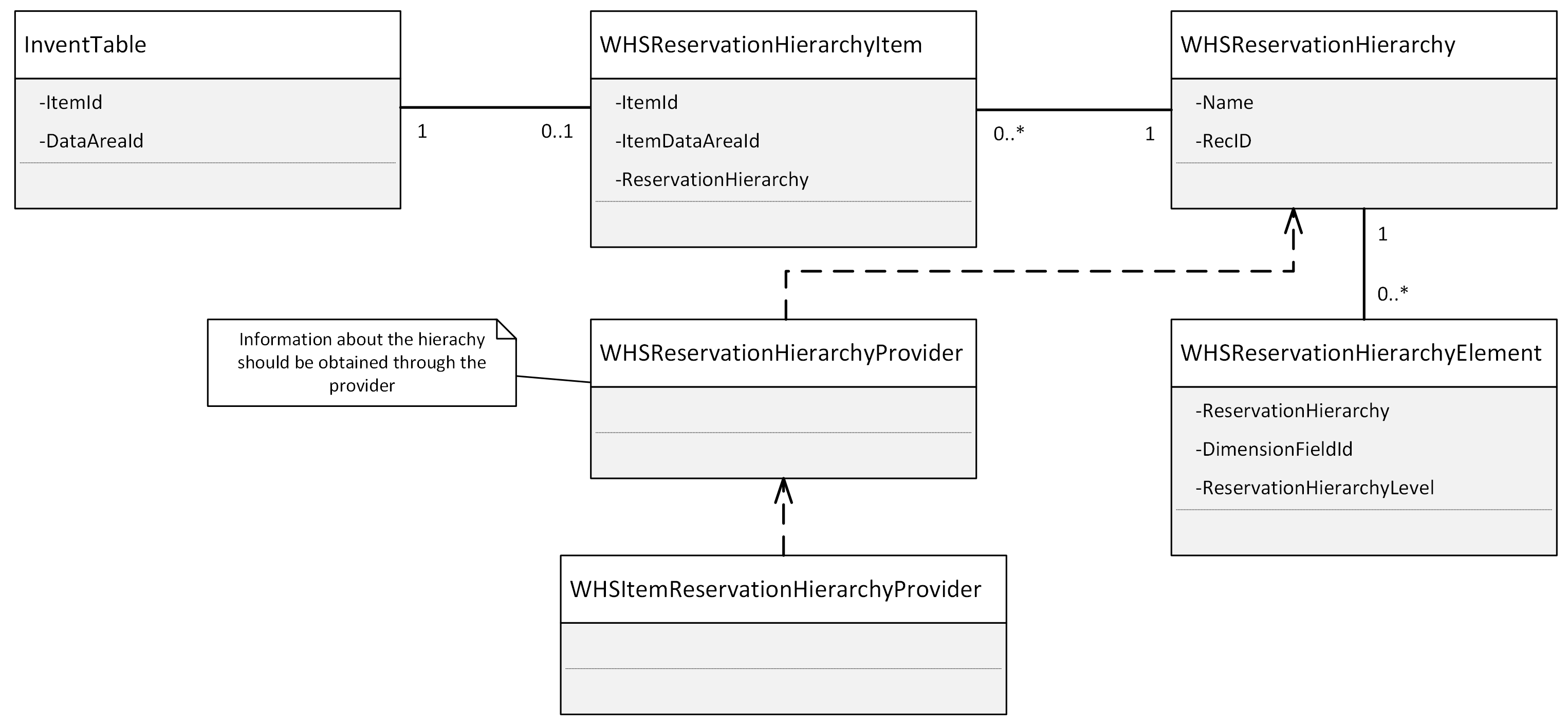 The definitions of reservation hierarchies are stored in the WHSReservationHierarchy and WHSReservationHierarchyElement tables. These tables are shared tables. A reservation hierarchy can be associated with one item within a company.