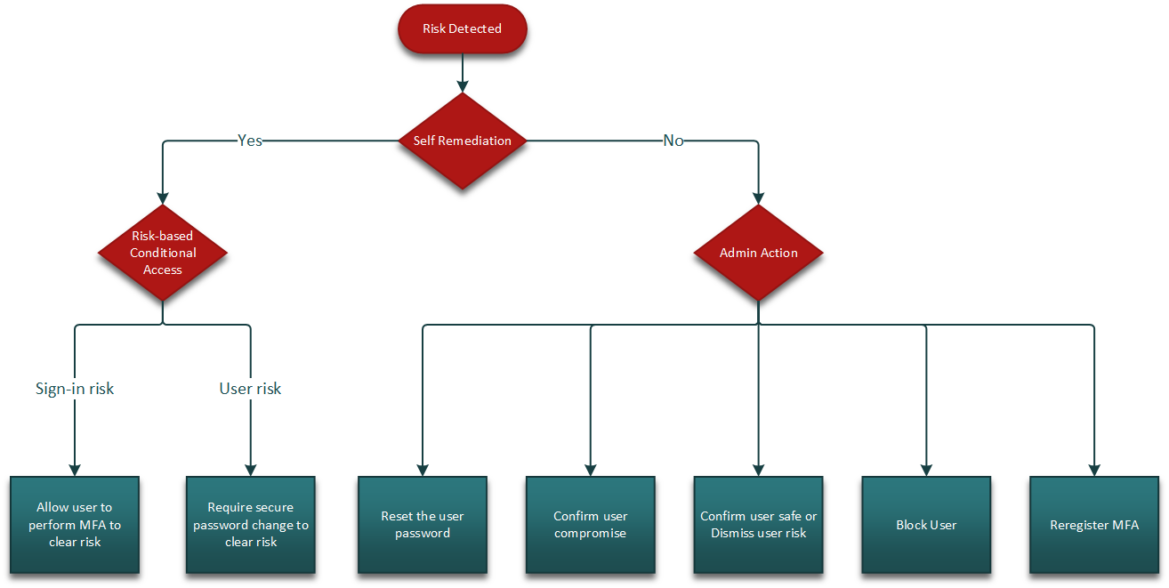 If self-remediation isn't an option, an administrator needs to remediate the risk. Remediation is done by invoking a password reset, requiring user to reregister for MFA, blocking the user, or revoking user sessions. The following flow chart shows the recommended flow once a risk is detected: