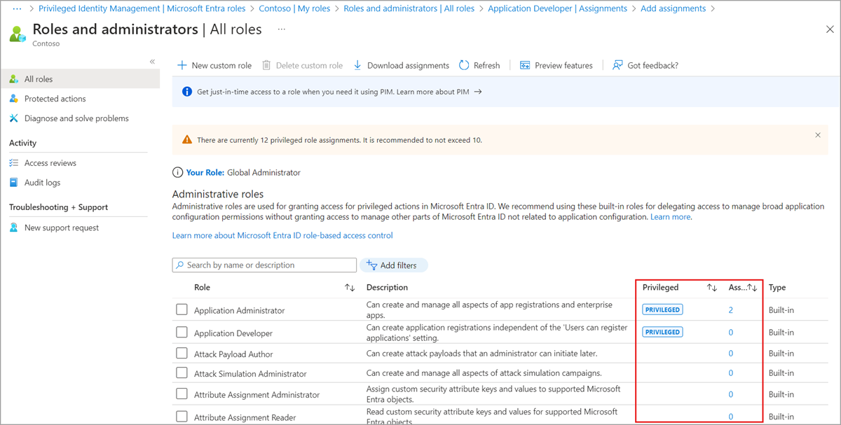 On the Roles and administrators page, privileged roles are identified in the Privileged column. The Assignments column lists the number of role assignments. You can also filter privileged roles.