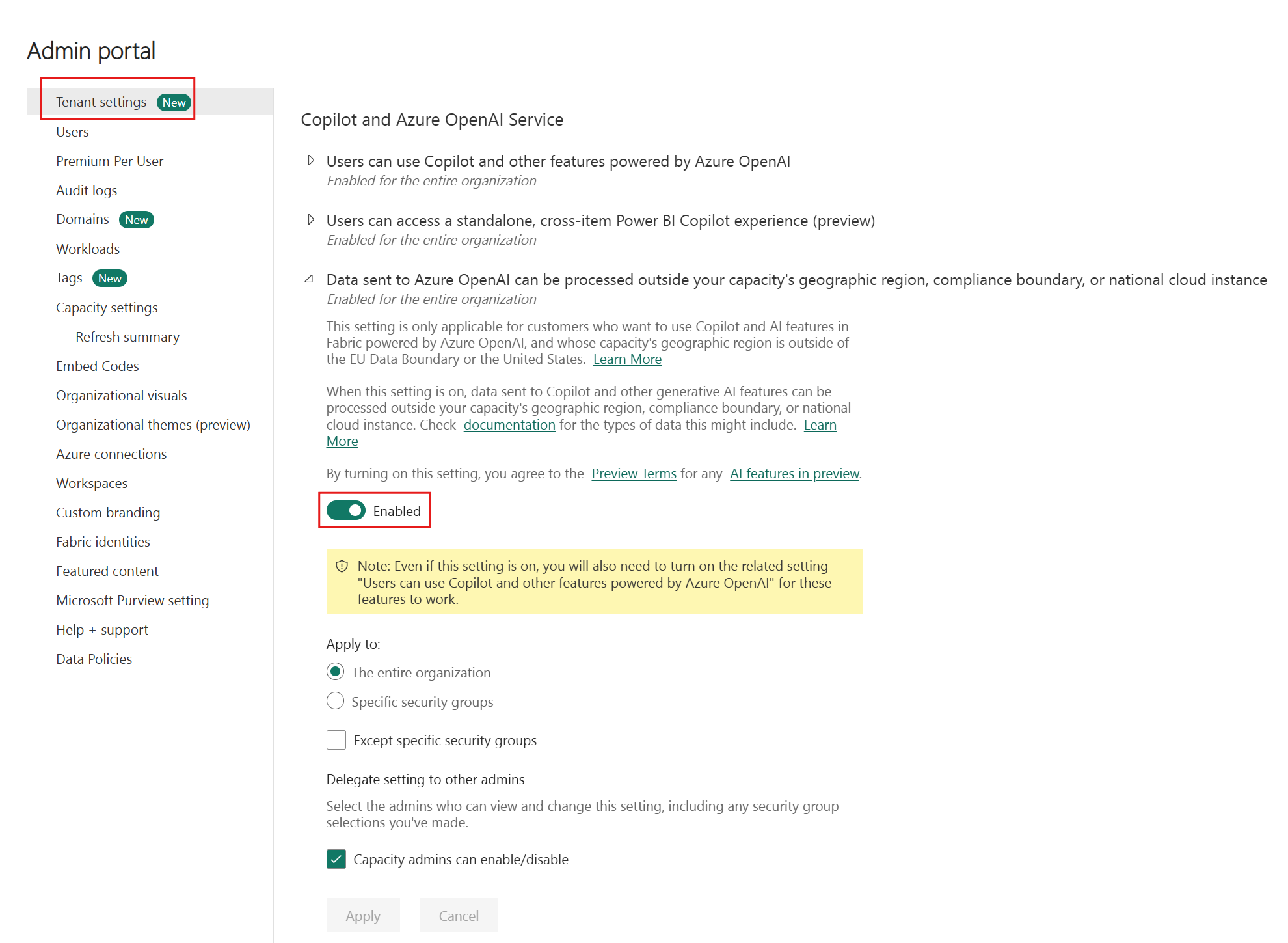 This setting is only applicable for customers who want to use Copilot and AI features in Fabric powered by Azure OpenAI, and whose capacity's geographic region is outside of the EU data boundary and the US. When this setting is enabled, service background jobs may execute across geographic boundaries at no charge to the tenant capacity to support end user experiences.