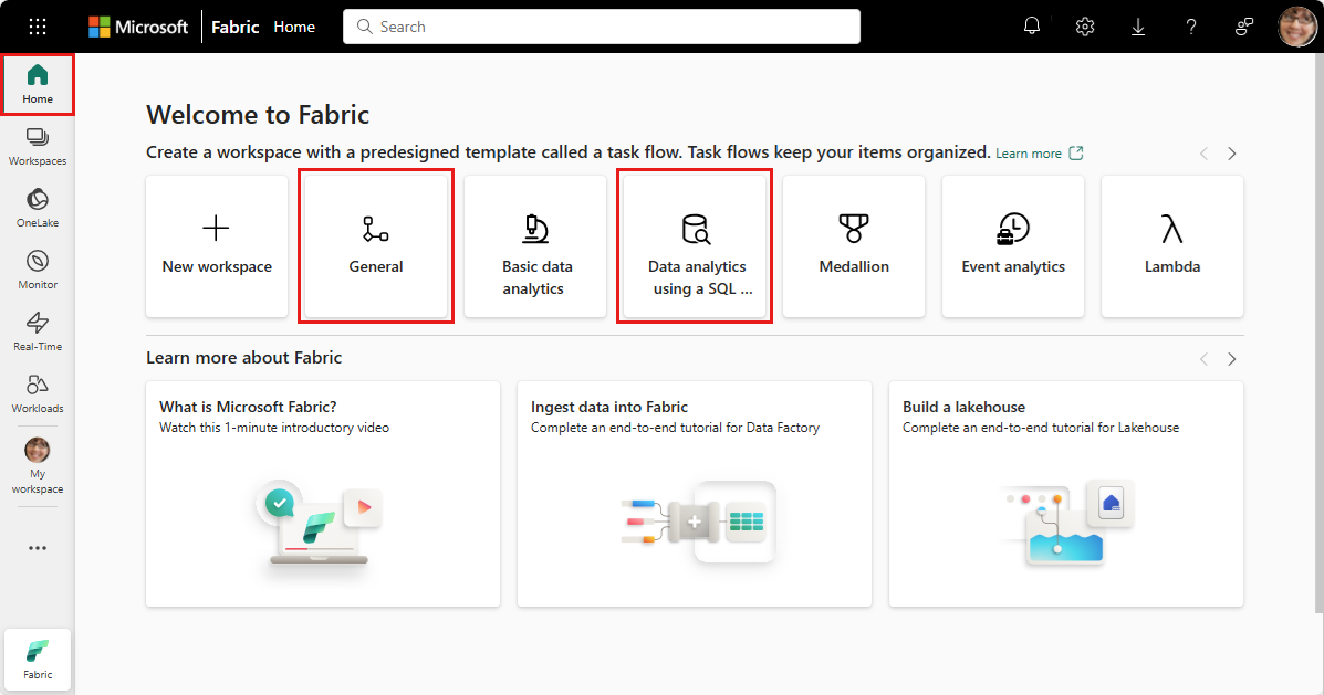 An alternate entry point to create a Spark job definition is the Data analytics using a SQL ... tile on the Fabric home page. You can find the same option by selecting the General tile.