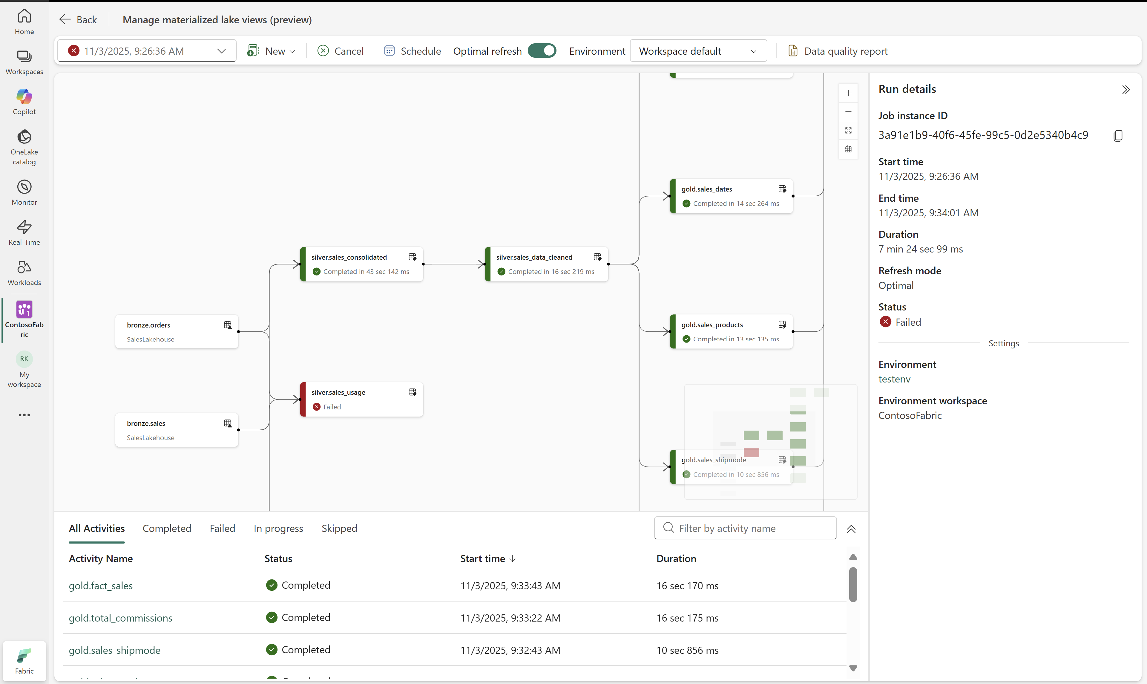 By selecting any of the runs, you can find the materialized lake view details on right side panel. The bottom activity panel provides a high-level overview of node execution status.