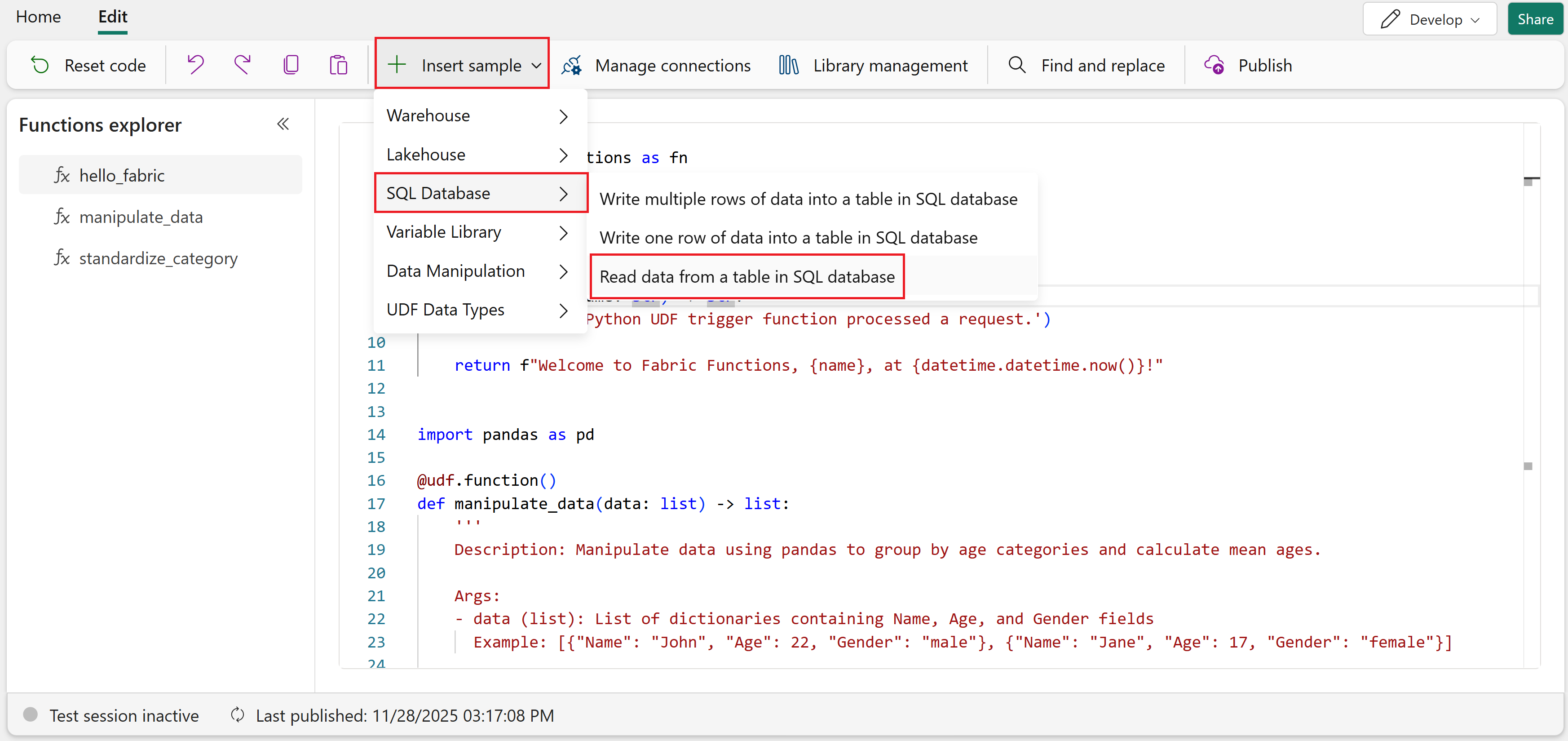 If you're not already in the editor, open your user data functions item and select Develop mode, then select the Edit tab.