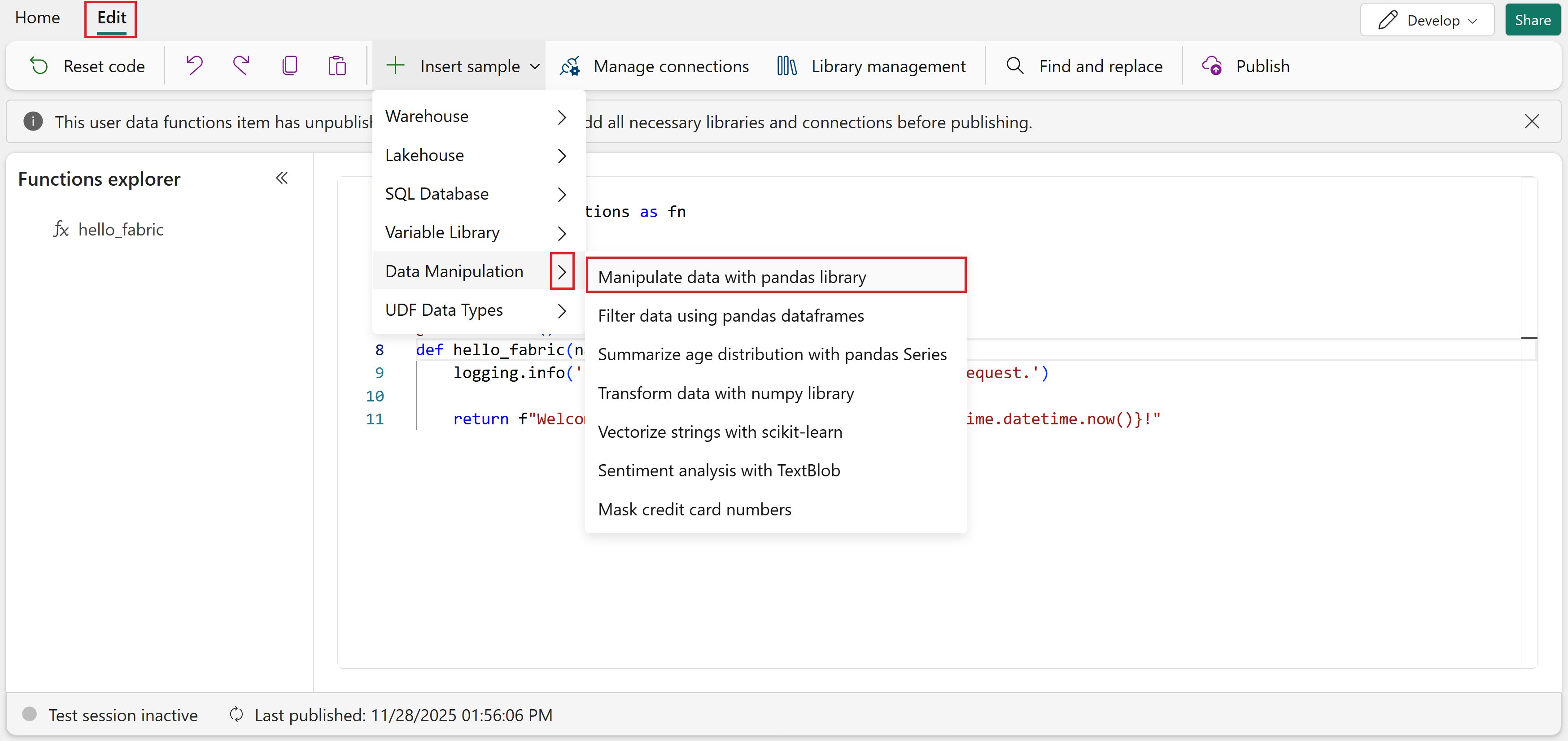 This example shows how to add a new function from the Insert sample menu. In this case, we add a function called Manipulate data with pandas library that uses the pandas library as a requirement.