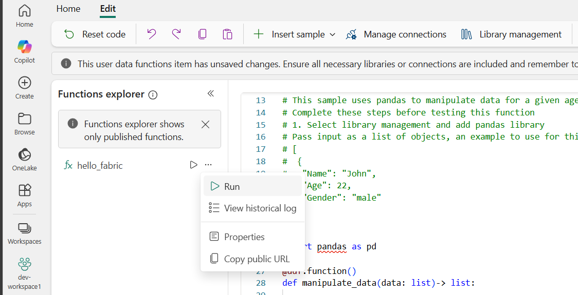 pandaslibrary to manipulate data.After the sample is inserted into the editor, you'll see the new function appear in the Functions explorer with a circle icon next to it. This icon indicates that the function changed since it was last published, meaning there are updates that need to be published.