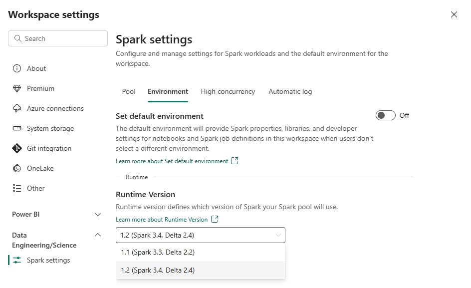 In the environment tab, you have the option to set the default environment. You may choose which version of Spark you'd like to use for the workspace.