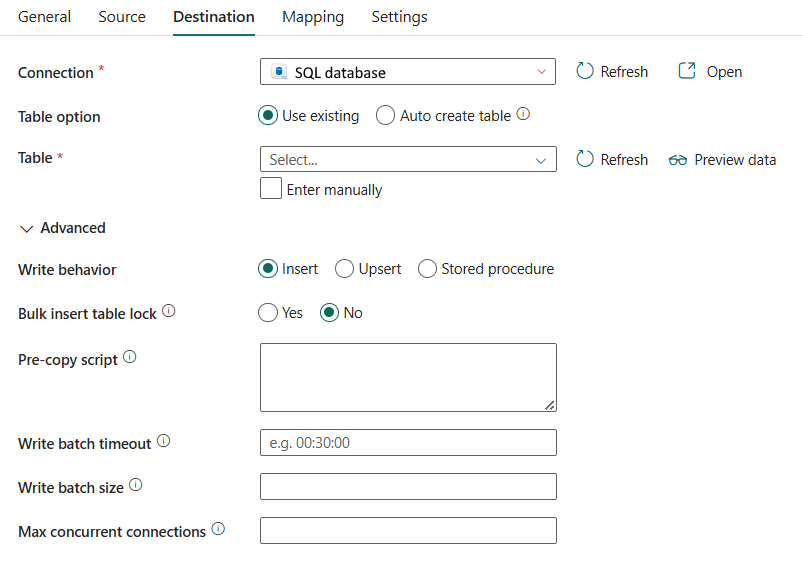 The following properties are supported for SQL database under the Destination tab of a copy activity.