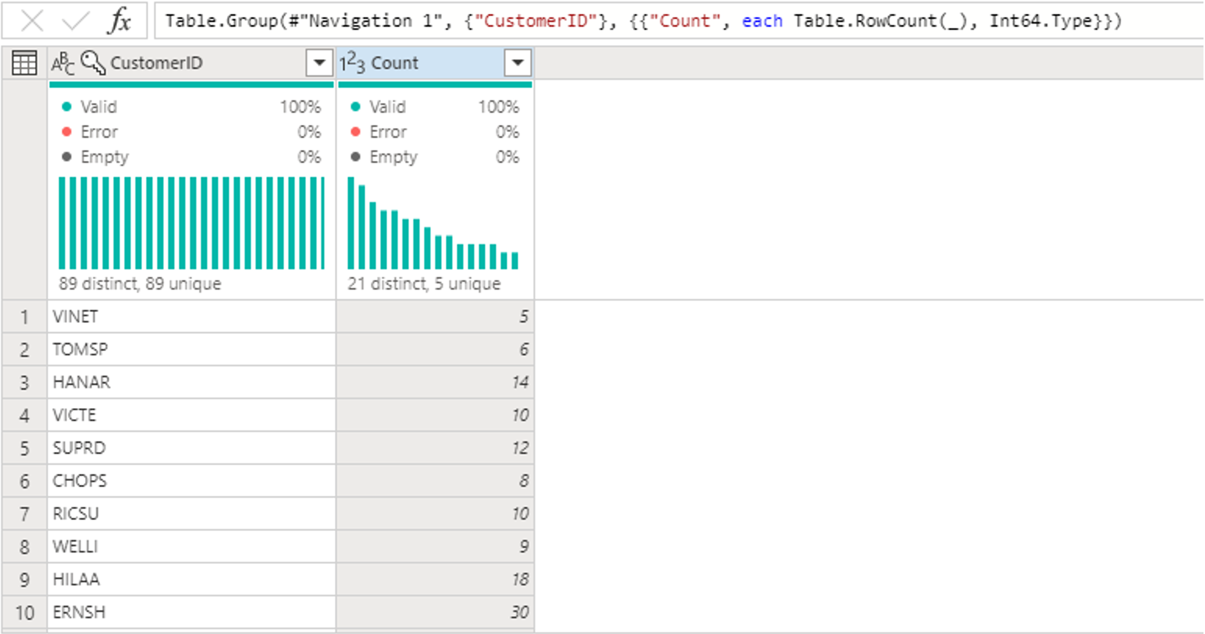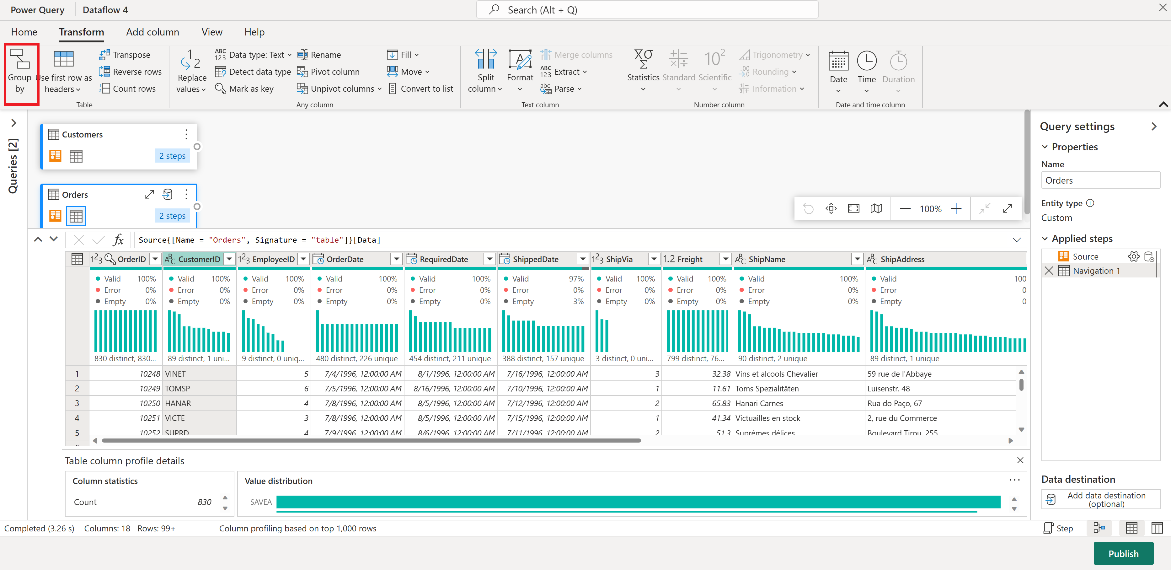 Within the Orders table, calculate the total number of orders per customer: Select the CustomerID column in the data preview and then select Group By under the Transform tab in the ribbon.