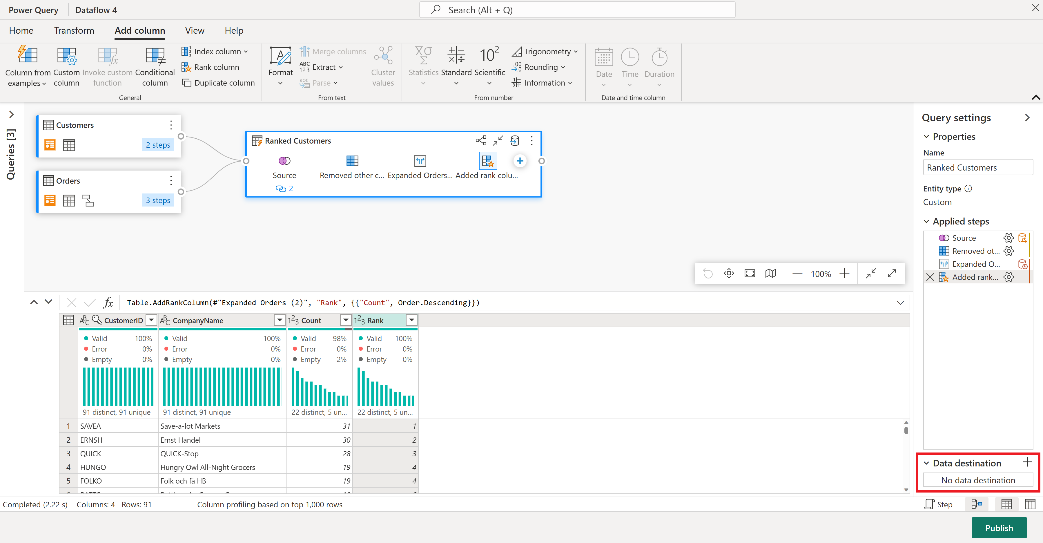 Now rename the resulting query as Ranked Customers using the Query settings pane on the right side of the screen.