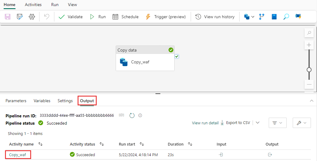 You can watch your pipeline run and see the results on the Output tab below the canvas. To check the details, select the activity name in the output list.
