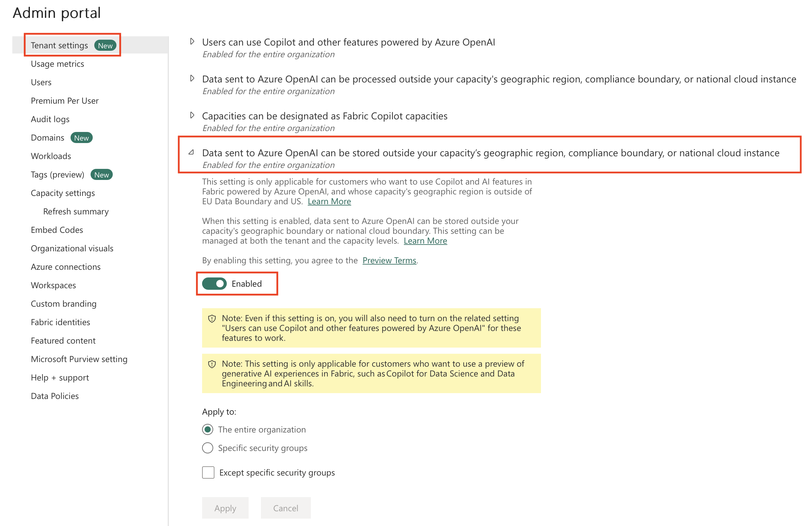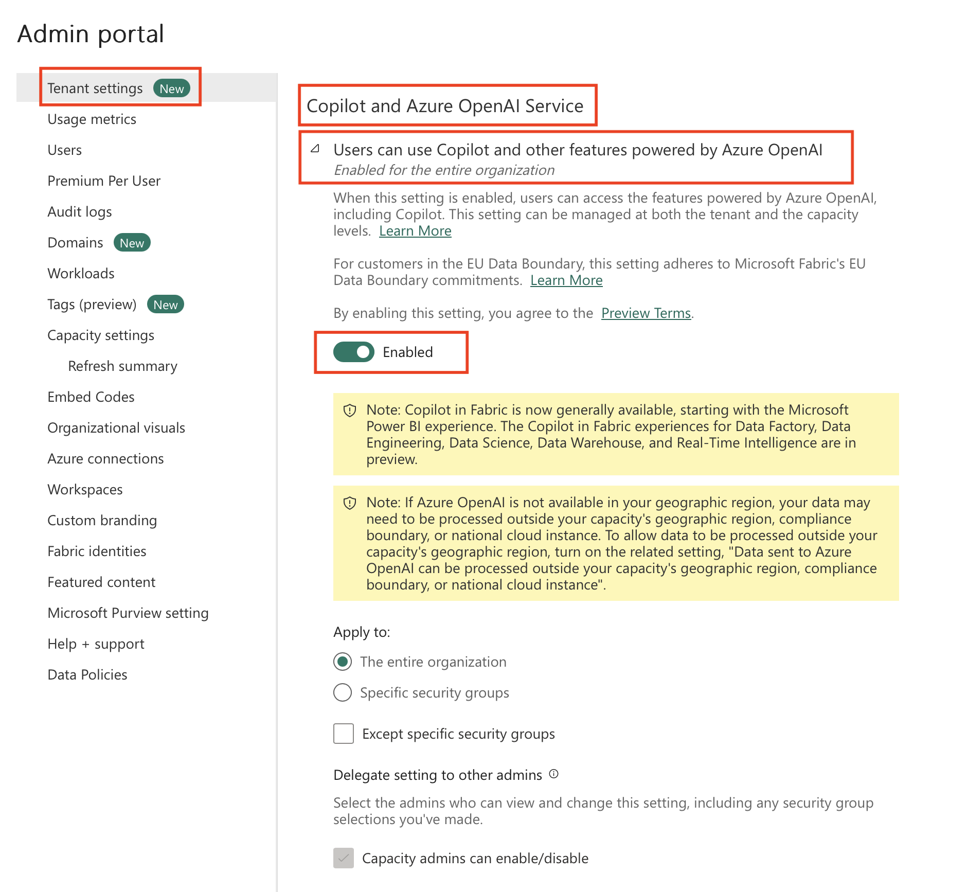 - This setting is only applicable for customers who want to use Copilot in Notebooks and Fabric data agents powered by Azure OpenAI whose capacity's geographic region is outside of the EU data boundary and the US.