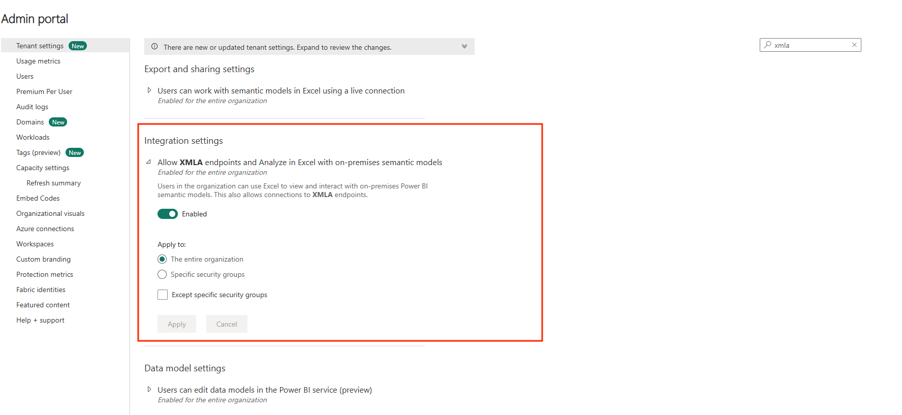 - Find Allow XMLA endpoints and Analyze in Excel with on-premises datasets and turn it on, as shown in the next screenshot: