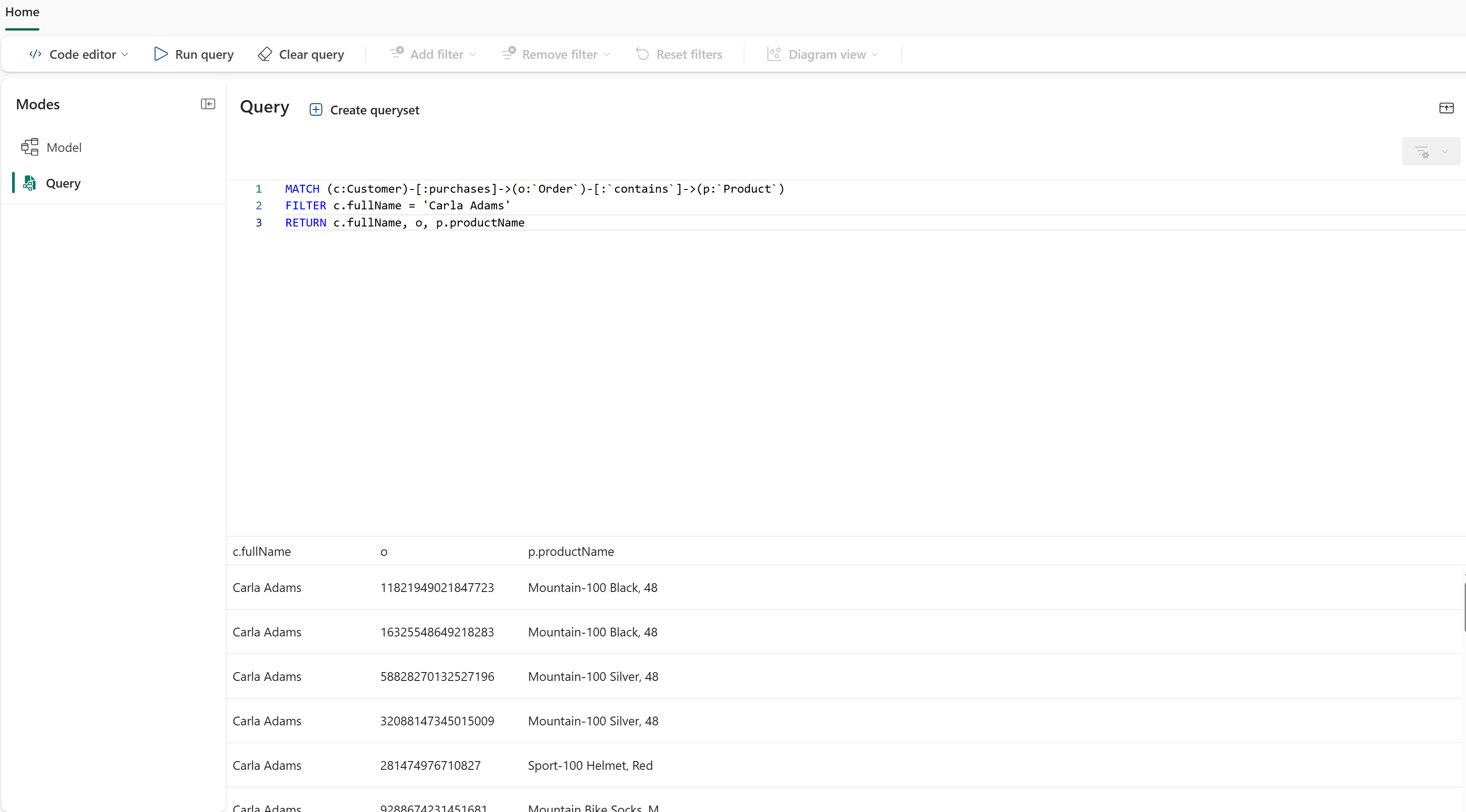In this tutorial step, you query your graph by using GQL (Graph Query Language) in the code editor. GQL provides powerful querying capabilities for complex graph patterns and analysis.