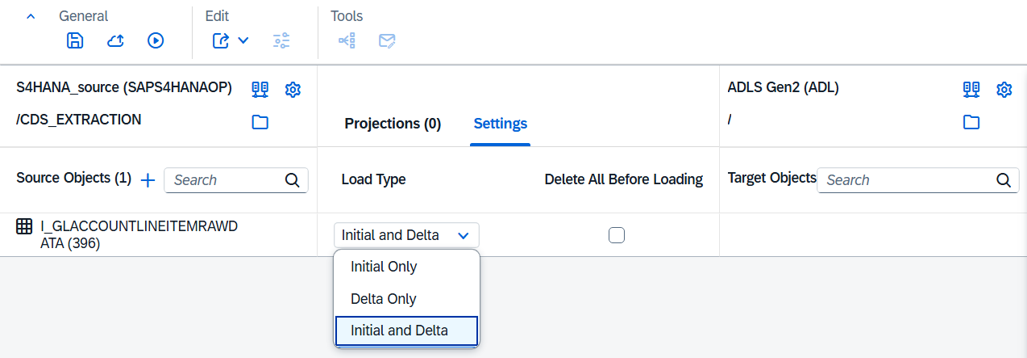 7. Configure the detail settings for the replication. Select Settings in the middle section of the canvas. Check and adjust the selected Load Type if needed. Currently, mirroring supports Initial and Delta or Initial Only.