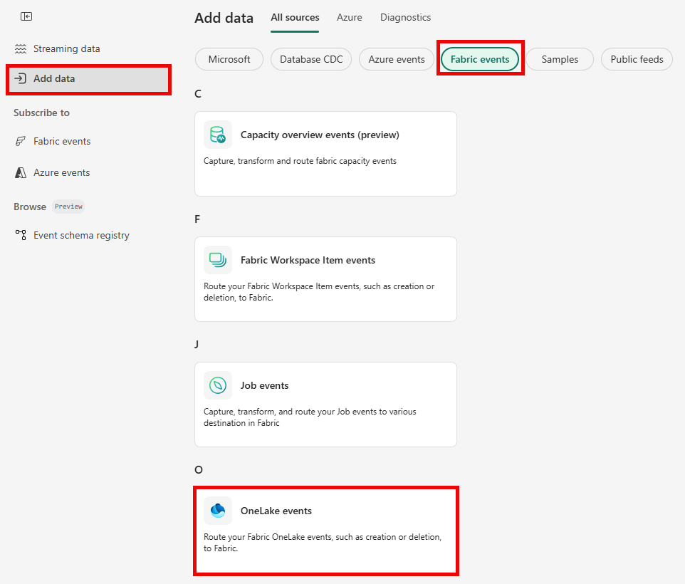 On the Fabric events page, select OneLake events from the list of Fabric events supported.