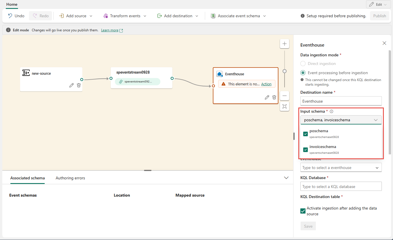 Configure eventstream destinations to use schemas