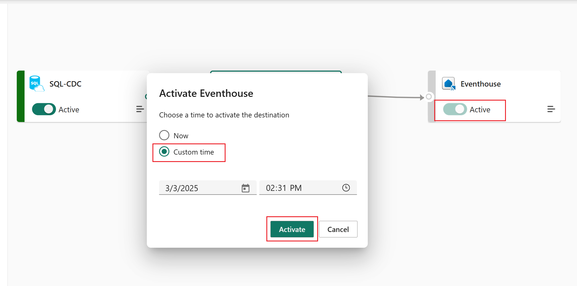 The Pause and Resume (that is, Deactivate and Activate) features in Eventstream give you a full control over your data streams, enabling you to pause data streaming from various sources and destinations within Eventstream. You can then resume data streaming seamlessly from the paused time or a customized time, ensuring no data loss.