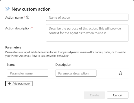 Actions: Define the actions that the agent can take based on the insights it generates. Name the action and provide a description to clarify its purpose. Optionally, list the parameters that the action requires, such as a specific value.