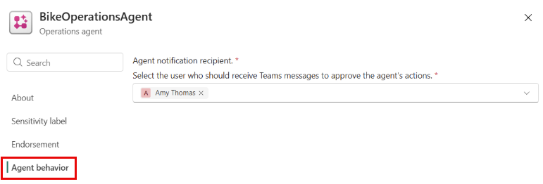 After installing the app, the agent can send messages in Teams when it identifies data that matches the specified conditions. These messages include a summary of the insights and recommended actions. You can update the recipients of these messages in the agent's configuration settings. Recipients must belong to your organization and have write permissions for the agent item in Fabric. You can find this in the operations agent item settings under Agent behavior.