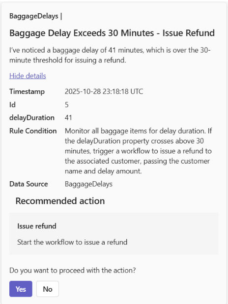 Choose Yes to approve or No to reject the recommendation. The message displays the values for any parameters identified by the agent. You can adjust these parameters if needed before providing final approval for the agent to take action.