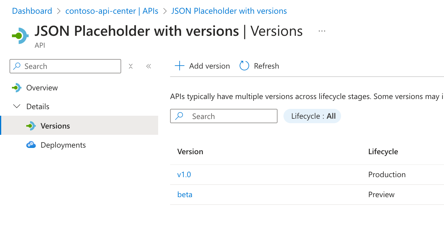 Before you start, create an Azure API Center instance and register APIs that you use in your organization. For each API, define the versions you use and specify their lifecycle stage.