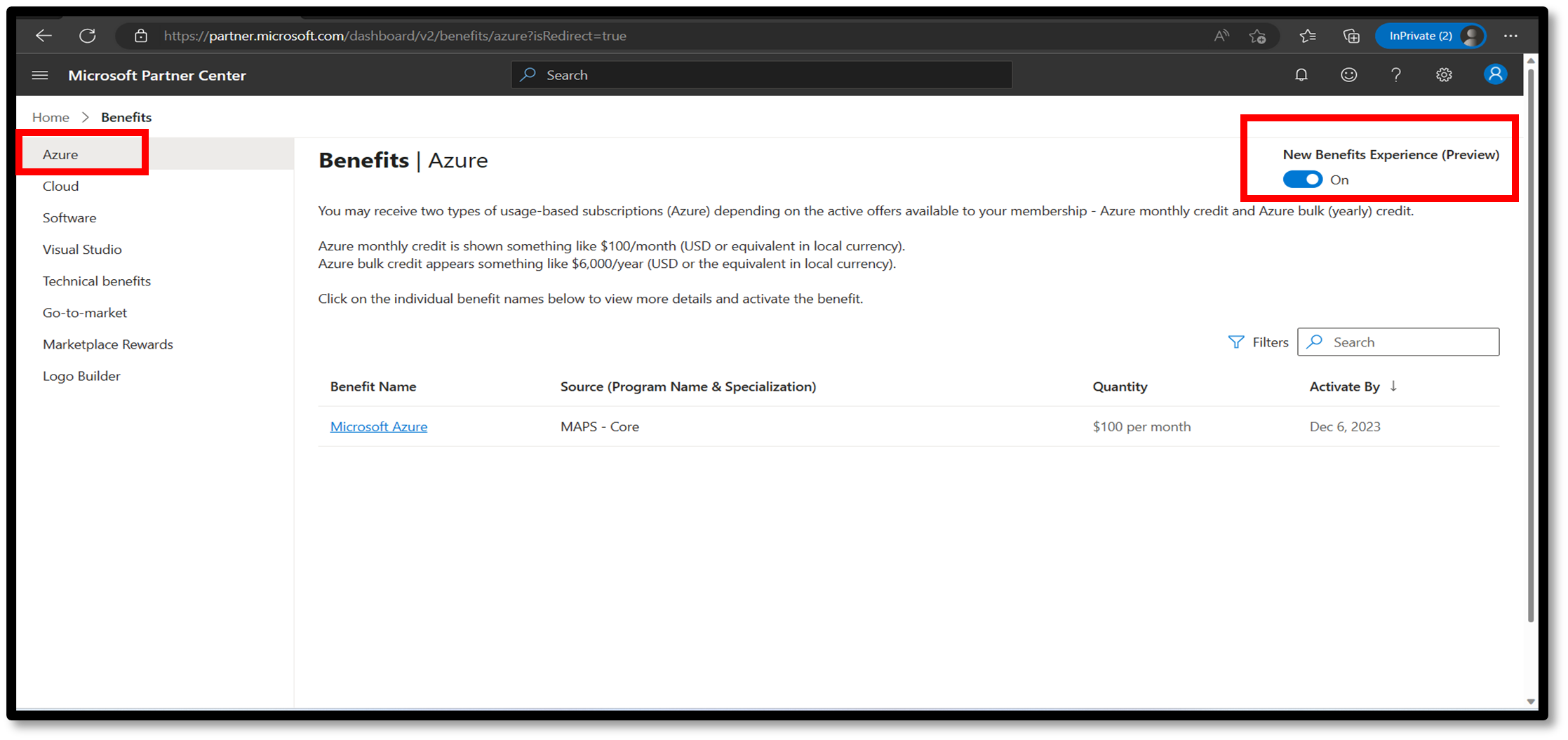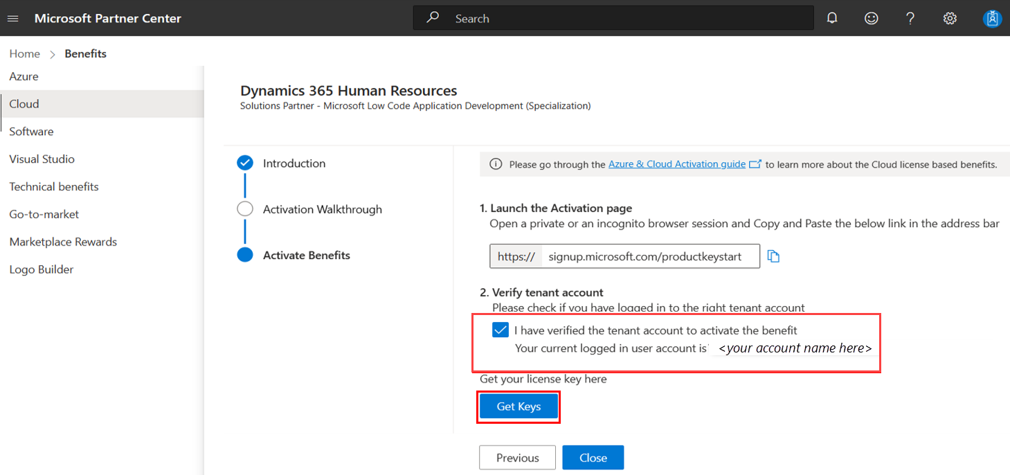 On the Partner Center Benefits menu, select Cloud.