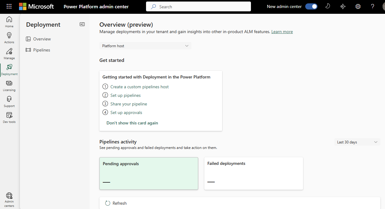 Pipelines in Power Platform allow you to manage the end-to-end deployment process across your organization. The deployment page makes it easy to view all the pipelines and deployment activity within the tenant.
