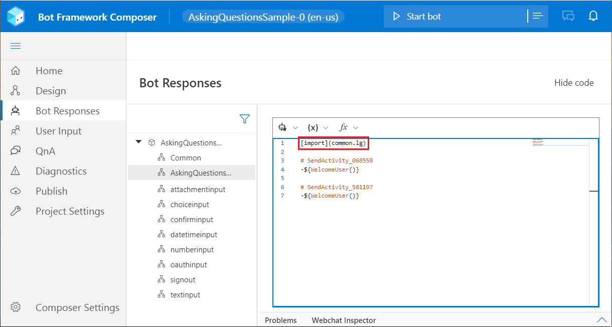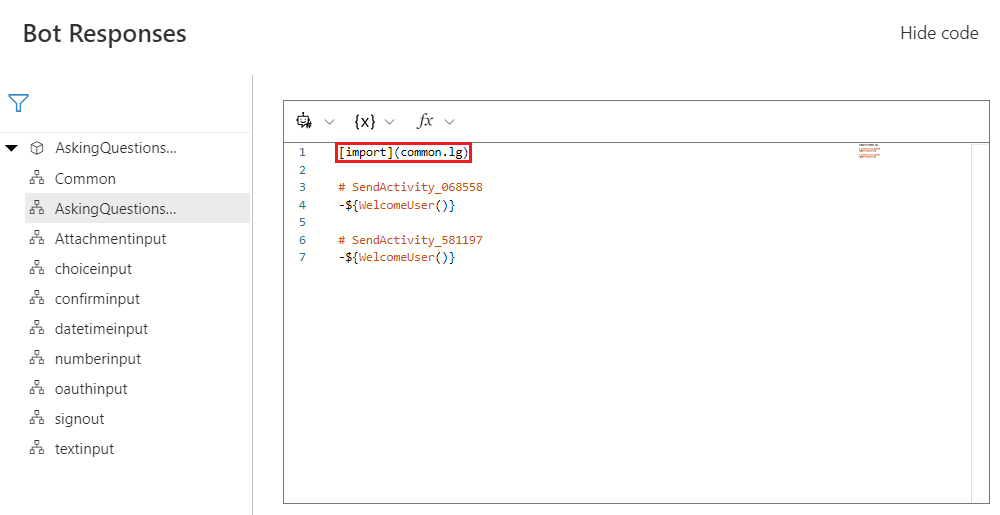 The Common entry in the list isn't associated with a specific dialog. The common language generation template is created by Composer, and is designed to be shared by other dialogs in your bot. To enable a dialog to see the templates it contains, select Show code on the upper right corner of the Bot Responses page to enable editing, then add [import](common.lg) in that dialog's template (See screenshot below). This tells that dialog's template to import all the items in the common template. For additional information on importing templates, see Importing external references in the .lg file format article.