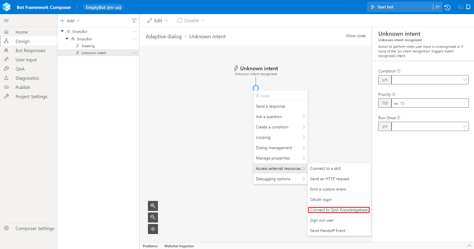To access the Connect to QnA Knowledgebase action, select + under the node you want to add the QnA knowledge base, and then select Connect to QnAKnowledgeBase from the Access external resources action menu.
